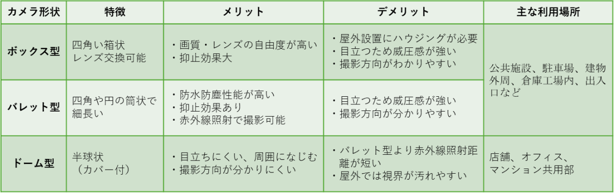 防犯カメラの形状により設置場所の向き不向きがあります。設置は屋外家屋内か、カメラの存在をわかりやすくするのか、によって違いがあります。